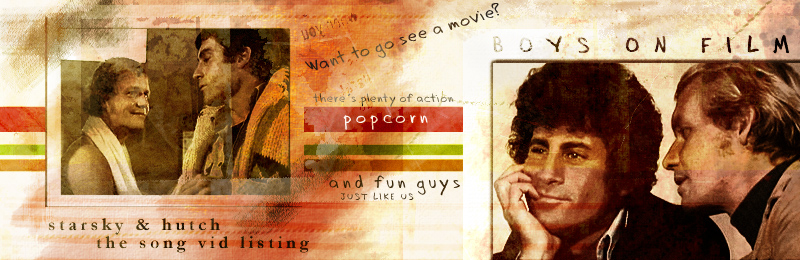 Welcome!Welcome to my Starsky & Hutch fanvid listing! The idea is to provide a comprehensive list of Starsky and Hutch vids, not only the ones that were posted recently and are available online, but I also plan to include the "classic" vids - the ones that were made with the good old VCRs. They have become a part of "fan history" and are in danger of being forgotten. This list is far away from being complete. It is a work in progress and it always will be. To keep this list up to date and make it as complete as possible, I need your help. If you know of any vids that are not included here, please let me know and send me an email. Thanks! Some of the vidders expressed their concern about listing their names together with the artists' names. To reduce the risk for the vidders to be tracked down by the music industry I decided to leave out the name of the artists. Most vidders provide the name of the artist / their music choice in their vids. If that isn't the case, there is always the possibility to contact the vidder (or me). You can choose between the vidder index (vids listed by vidder) and the title index (vids listed by song title). Thanks to the many people who helped and encouraged me to do this list! Special thanks to Sonja for the wonderful header and to Kassidy for hosting this site! |
